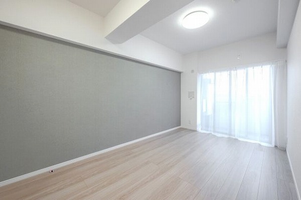 こちらの洋室は約7.8帖と、ゆったりとした造り。グレーのアクセントクロスがさりげなく個性を添え、シンプルながら洗練された空間に仕上がっています。たっぷりと光が入るため、寝室として使用すれば目覚めの良い1日をスタートできそうです♪
