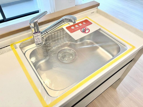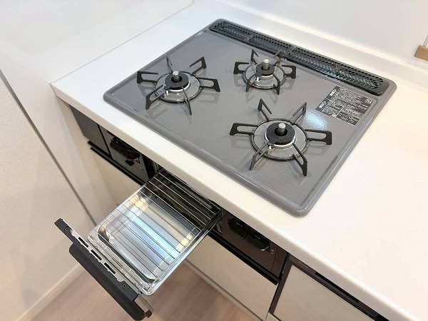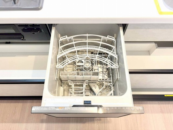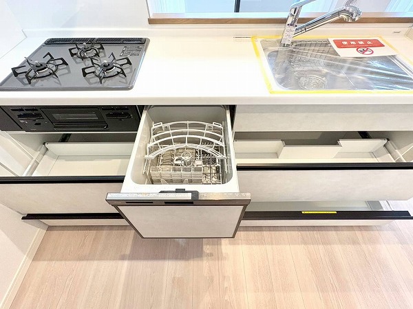 程よく空間とつながるセミオープンキッチンは、家族の気配を感じながら料理ができる心地よい設計。グリル付き3口コンロに加え作業しやすいワークトップを確保し、同時調理も効率的。食洗機付きなので、後片付けの時間を家族団らんに充てられるのも嬉しいポイント♪
