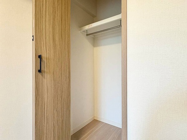 さらにこちらの洋室にはウォークインクローゼットを完備。ハンガーパイプ付きで丈のある衣類も美しく収納でき、シワを防ぐことも。スーツケースなどの大型荷物も無理なく収まり、枕棚には季節物の収納がおすすめです。