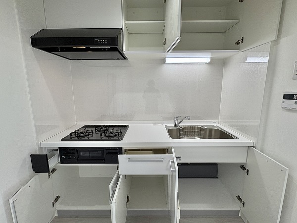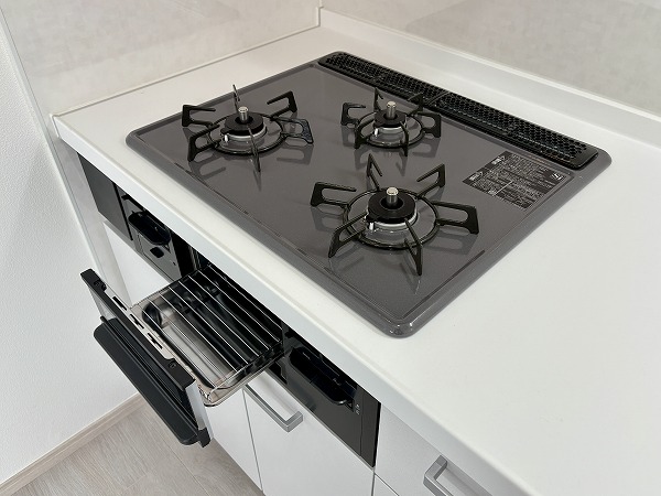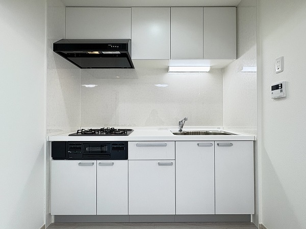 清潔感あふれるホワイトをベースに、ブラックのさりげないアクセントが目を引く壁付けキッチン。グリル付きの3口コンロで本格的な料理も自由自在。シンプルでありながら存在感のあるデザインは、キッチンに立つ時間さえも豊かなひと時に変えてくれますね。