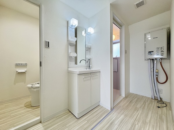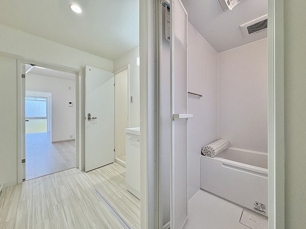 リビングからアクセスしやすい水回りは、パウダールーム、洗面化粧台、独立トイレ、バスルーム、洗濯機置き場がまとまり、家事や身支度の動線を考え抜いた設計です。朝の忙しい時間でも、洗面台で顔を洗いながら洗濯機を回し、トイレやバスルームも同時にスムーズに利用可能。