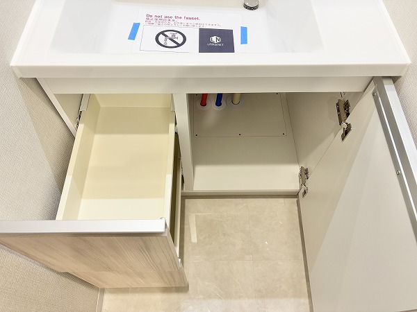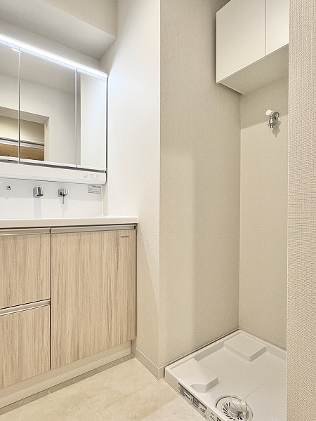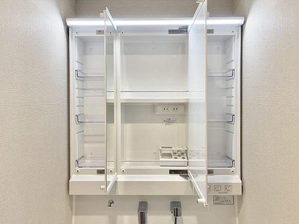独立洗面化粧台は3面タイプのミラーキャビネット式で、合わせ鏡としてもご利用いただけます。鏡裏にはコンセントが付いているため、ドライヤーやヘアアイロンを利用する際に便利です◎収納が充実しているのも嬉しいポイント。