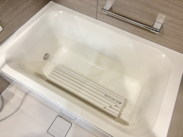 温かみを感じられるブラウンのバスパネルが印象的なバスルーム。バスタブは1317サイズとゆとりがあるので、足を伸ばして快適にくつろぐことができますよ。雨の日のお洗濯の際に大活躍する浴室乾燥機が搭載されています。
