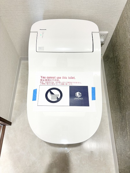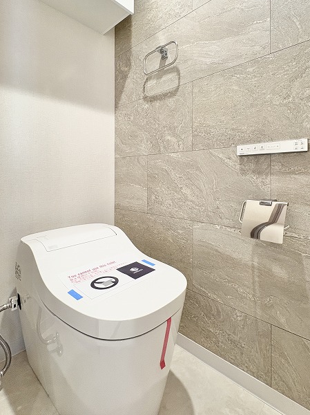 独立タイプのトイレは、オシャレなアクセントクロスが特徴的。タンクレス型なので掃除がしやすく、空間が広く見えますよ。上部にはトイレ用品をしまうことのできるキャビネットが設置されています。