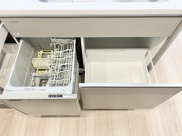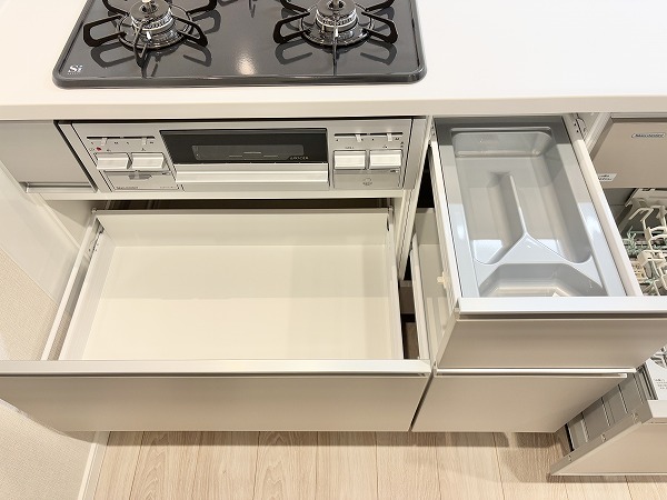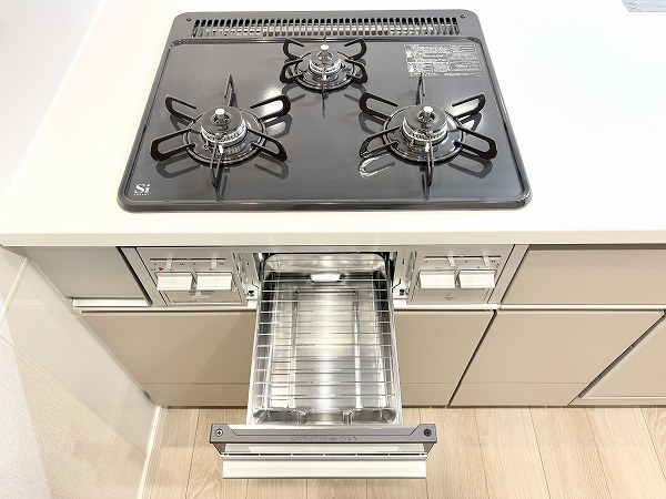 お料理に集中しやすい壁付け型のキッチンは、グレー×ホワイトで洗練された雰囲気✨上部とシンク下に収納が充実しているため、キッチン用品の収納には困りません◎毎日の家事効率が上がる3口コンロ、グリル、食洗機が完備されています。
