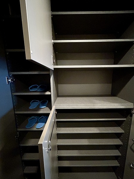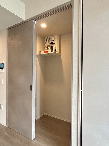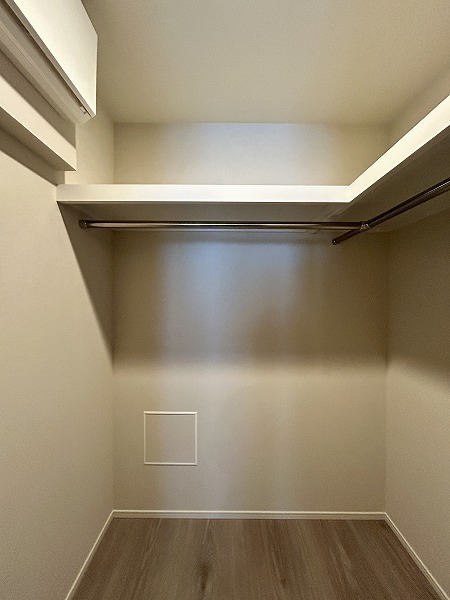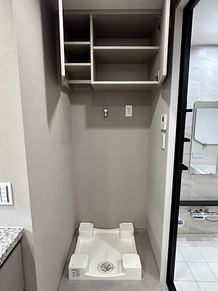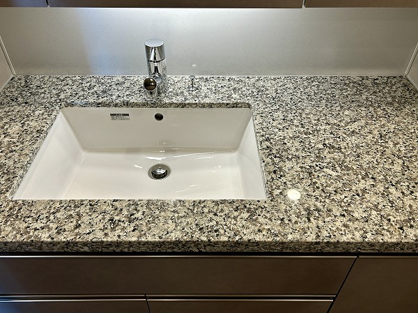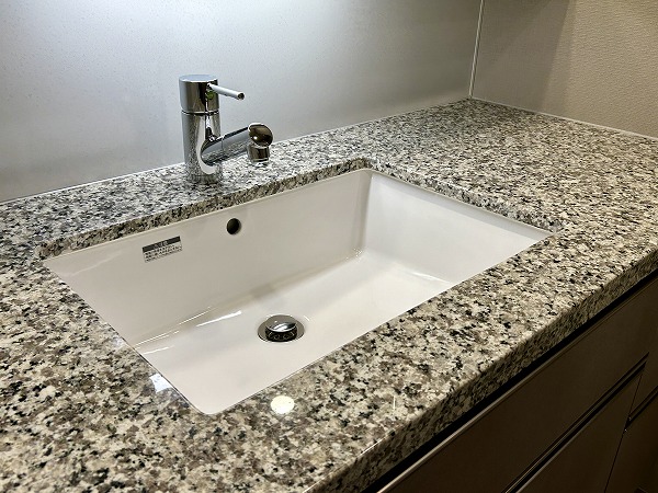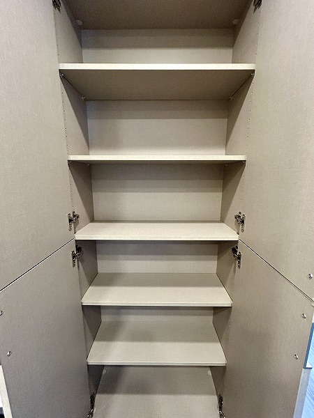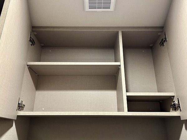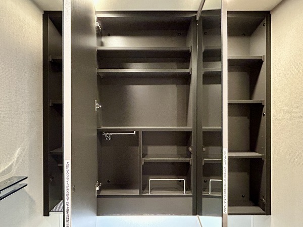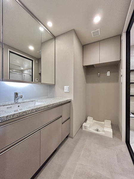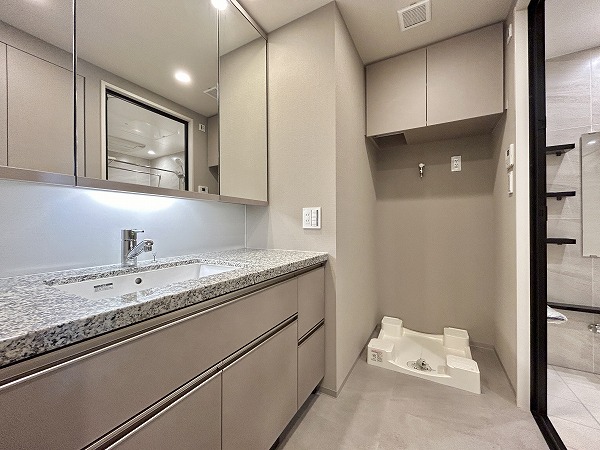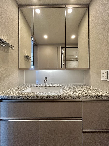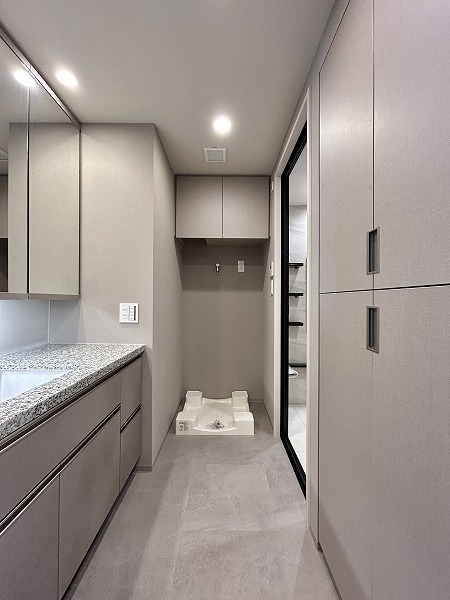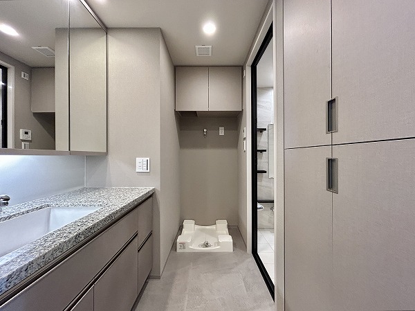 パウダールームは収納力たっぷりで、洗面用品からタオルやリネンまですっきり整理可能✧洗面台のボウルは左側に配置されているため、右側のスペースにはスキンケアアイテムやメイク道具を広げて、快適に身支度できちゃいます◎