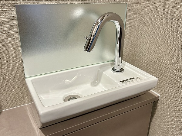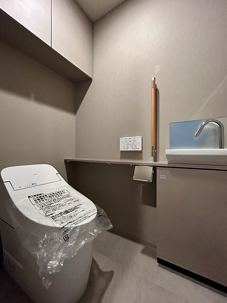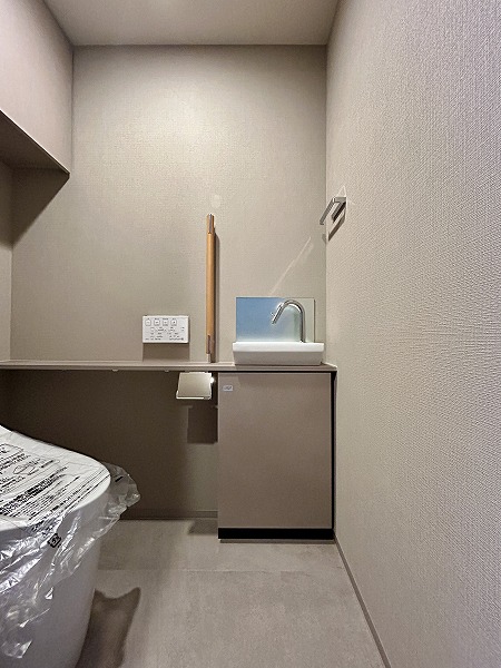 パウダールームとトイレは落ち着いたグレーで統一されたシックなデザイン。シンプルながら洗練された印象で、余計な装飾がなくても十分おしゃれに見えます。手洗い器と手すりも設置されているため、快適にご使用いただけますよ✿
