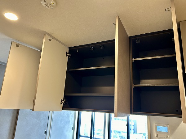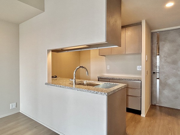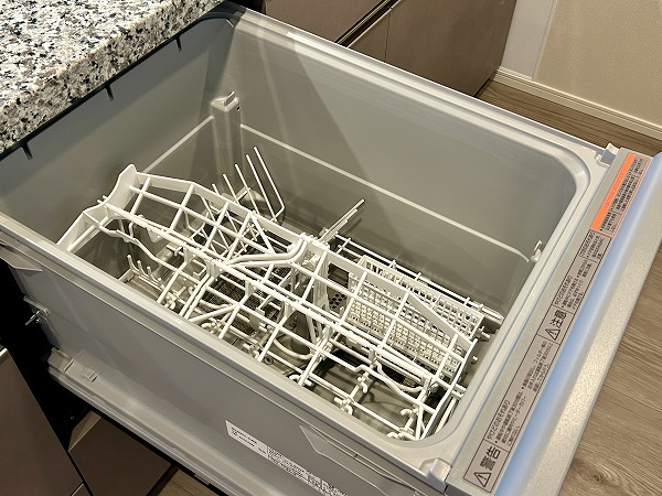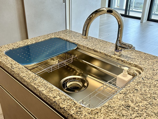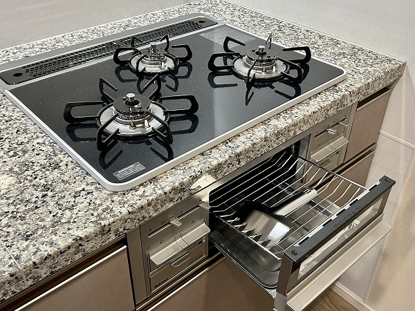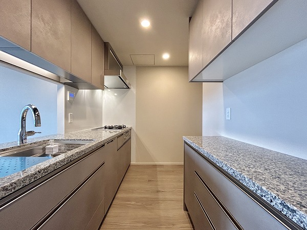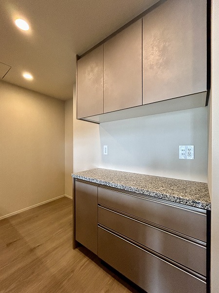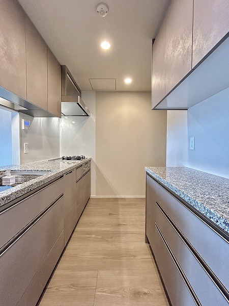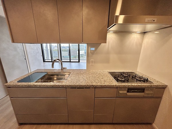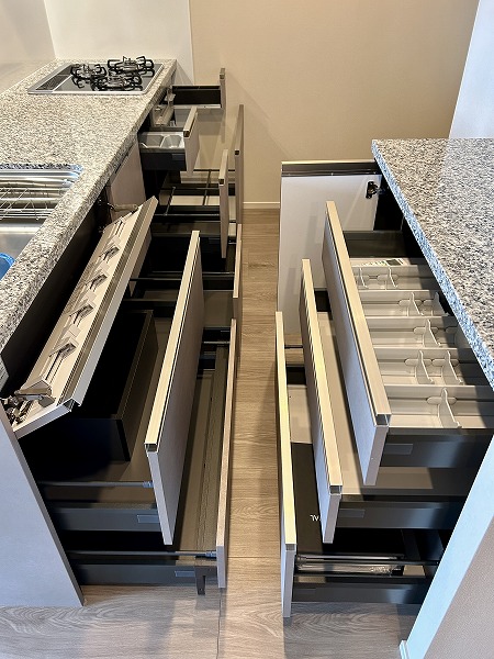 対面式で開放感のあるキッチンは、ゆったりとした作業スペースが魅力。お揃いのカップボードも設置され、収納力も抜群です。ディスポーザーや食洗機など日々の家事をサポートする設備が揃っているので、後片付けもスムーズに行えますよ。