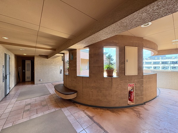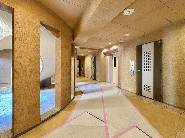 オートロックの扉を抜けると、その先にはアーティスティックな形のエレベーターホール&1階共用廊下が広がっています。