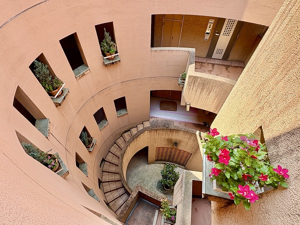 こちらは上階の外廊下です。らせん階段を囲う壁がとにかく目を惹きますね✿屋外ですが外からの視線はほとんど気になりません。