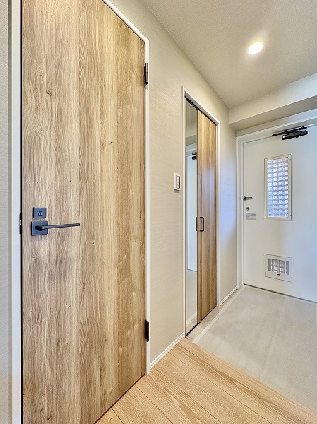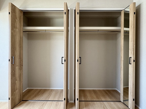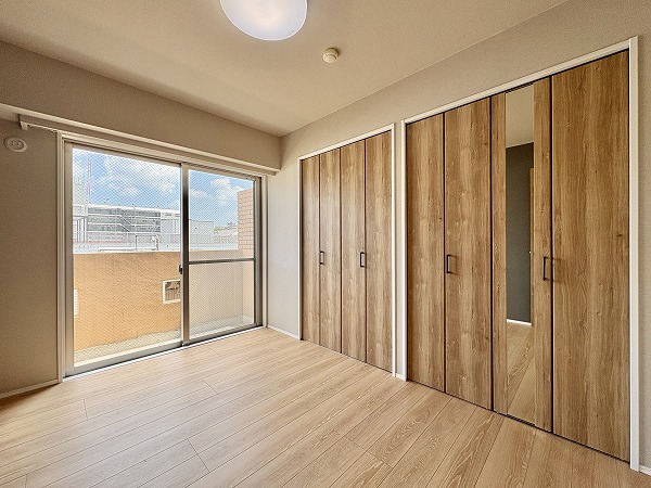 ジェイパーク三軒茶屋_リフォーム済みの内装の写真 もうひとつの洋室には両開きのクローゼットが2つ。大容量な上に全身鏡まで付いており、とても使いやすそうです。さらに全居室がバルコニーに面しているのも嬉しいポイント。アプリコットカラーの外壁と青空のコントラストが素敵でした☀