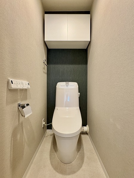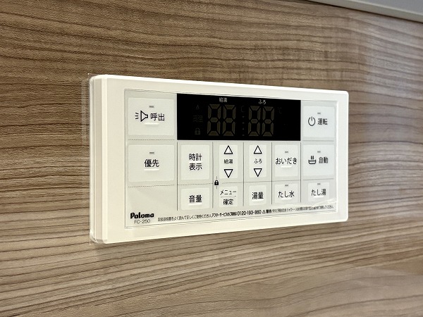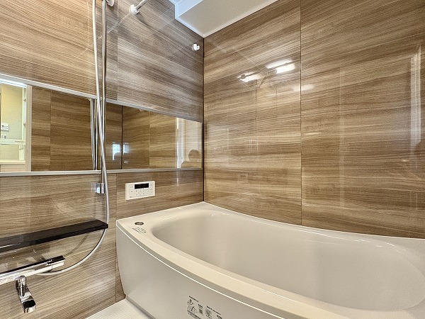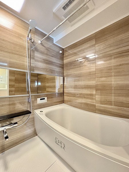 バスルームももちろん木目調。便利な追い焚き機能&浴室乾燥機付きです。マンションのユニットバスとしては標準的な1416サイズなので、特に身長が高い方でなければ窮屈感なく入浴できるでしょう。