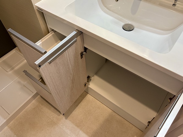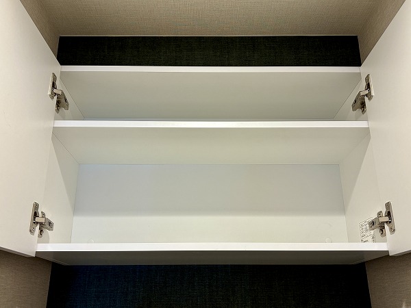 ジェイパーク三軒茶屋_パウダールームの写真 バスルームの前には3面鏡型の洗面化粧台と洗濯機置き場が。無駄なくコンパクトなレイアウトです。洗面化粧台の横に可動棚が付いているため、タオルや美容グッズの置き場としてご利用ください。