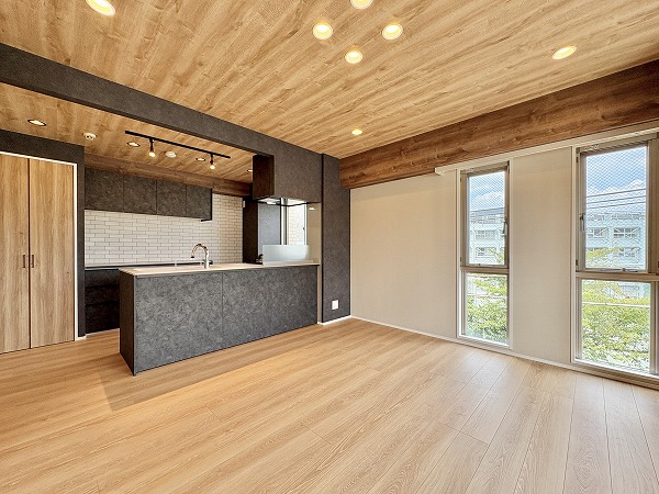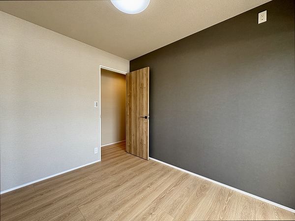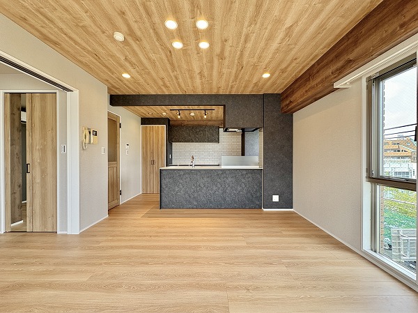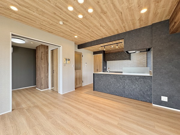 木目の天井とダークなアクセントカラーの組み合わせが特徴的です。温かみがありながらどこかスパイスの効いたデザインがカッコいいですね✦隣接する洋室と繋げて使うと、より広々とした印象になります。