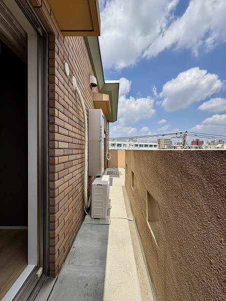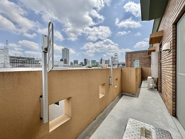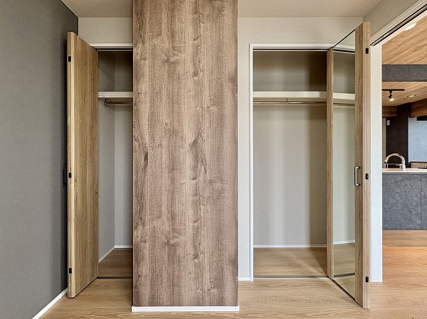もうひとつの洋室には両開きのクローゼットが2つ。大容量な上に全身鏡まで付いており、とても使いやすそうです。さらに全居室がバルコニーに面しているのも嬉しいポイント。アプリコットカラーの外壁と青空のコントラストが素敵でした☀