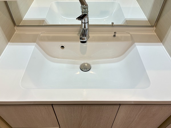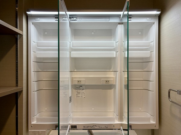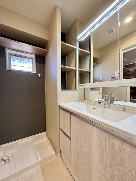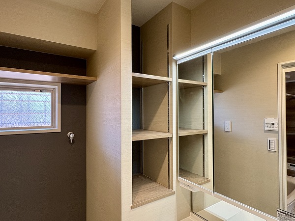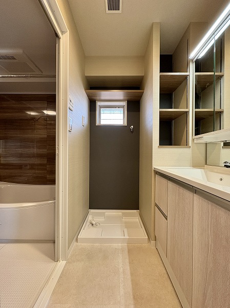 バスルームの前には3面鏡型の洗面化粧台と洗濯機置き場が。無駄なくコンパクトなレイアウトです。洗面化粧台の横に可動棚が付いているため、タオルや美容グッズの置き場としてご利用ください。
