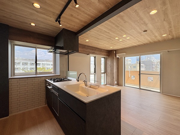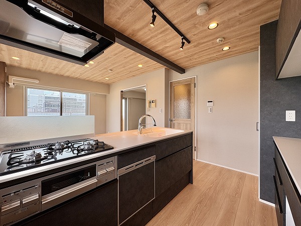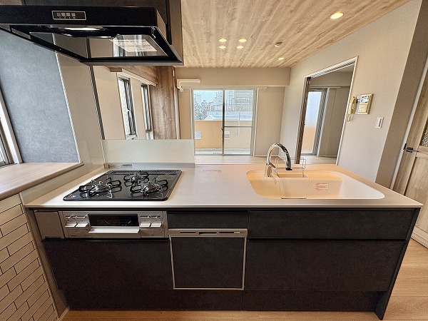 ジェイパーク三軒茶屋_新設された水回り設備の写真 内装のアクセントになっているブラックカラーのシステムキッチン。ワークトップとシンクが白なので見た目が重くなりすぎず、絶妙にお洒落です。センサー水栓に食洗機、グリル付3口コンロを完備するなど機能性も充実しています。