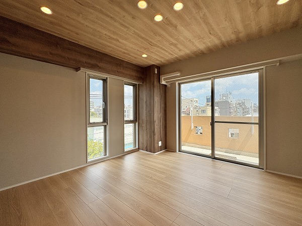 ジェイパーク三軒茶屋_最上階角部屋の写真 北と東の2方向に窓が付いた通気性抜群なメインルーム。おおよそ12.62帖です。キッチン側の窓は北向きなので直射日光が入りづらく、夏場でも快適に過ごせますよ◎さりげないタイルの装飾がお洒落!