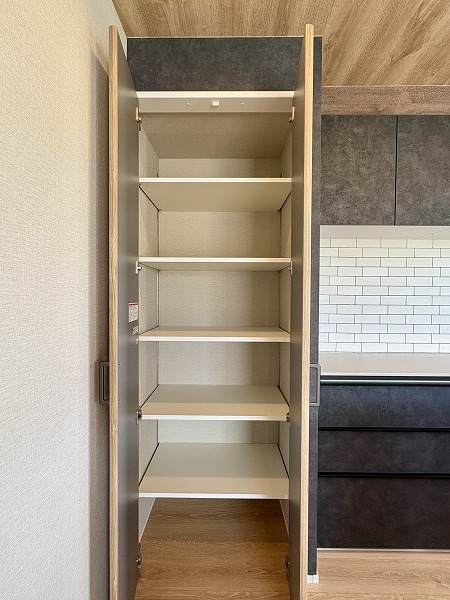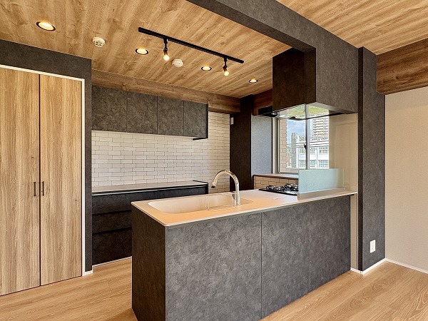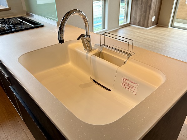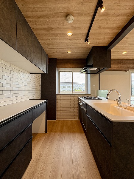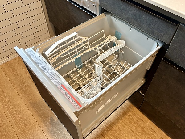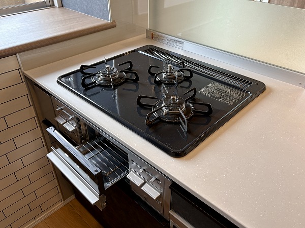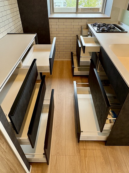 内装のアクセントになっているブラックカラーのシステムキッチン。ワークトップとシンクが白なので見た目が重くなりすぎず、絶妙にお洒落です。センサー水栓に食洗機、グリル付3口コンロを完備するなど機能性も充実しています。