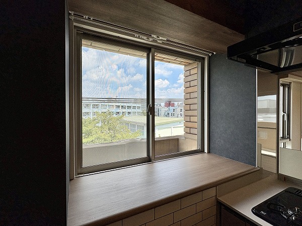 北と東の2方向に窓が付いた通気性抜群なメインルーム。おおよそ12.62帖です。キッチン側の窓は北向きなので直射日光が入りづらく、夏場でも快適に過ごせますよ◎さりげないタイルの装飾がお洒落!