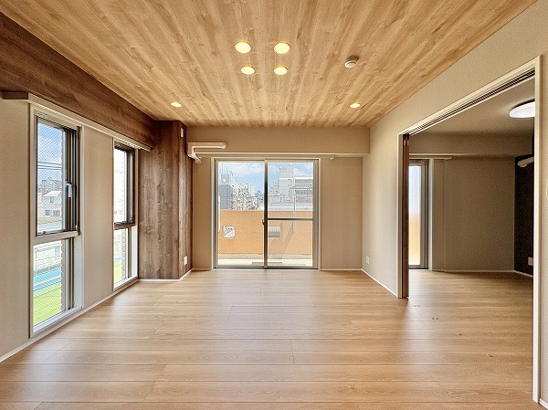 ジェイパーク三軒茶屋_4階住戸の写真 木目の天井とダークなアクセントカラーの組み合わせが特徴的です。温かみがありながらどこかスパイスの効いたデザインがカッコいいですね✦隣接する洋室と繋げて使うと、より広々とした印象になります。