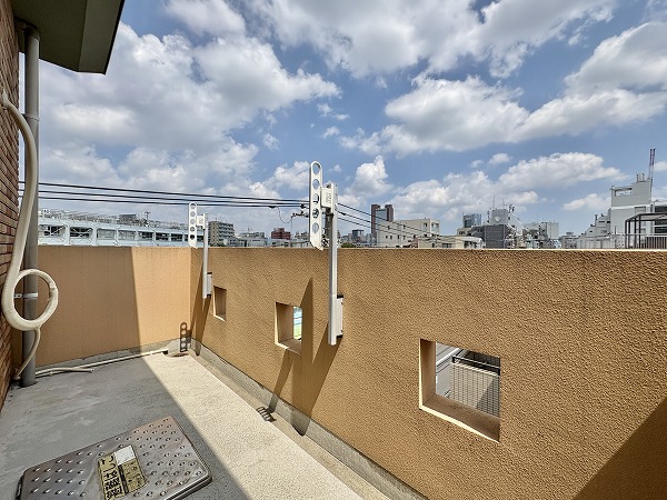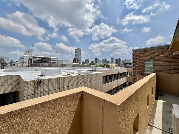 ジェイパーク三軒茶屋_陽当たり良好なバルコニーの写真 アプリコットカラーの外壁を四角くくり抜いたデザインが可愛い、東向きのバルコニー。住宅街に立地しながら程よく視界が開けており、陽当たり&風通し良好です☀道路を挟んで目の前には小学校が見えました。