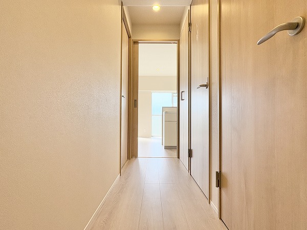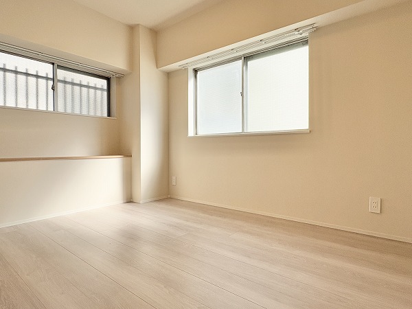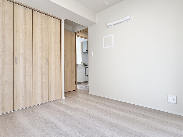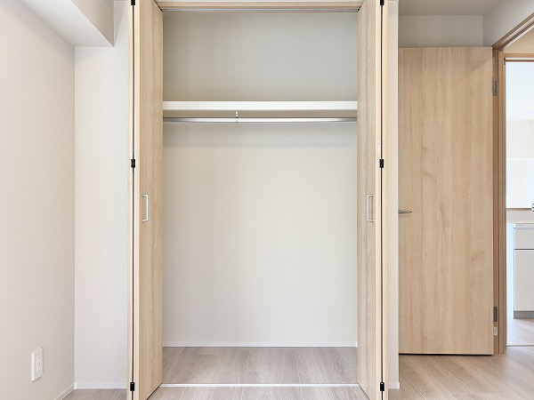 約5.4帖の洋室は、どんなテイストの家具やインテリアも合わせやすいナチュラルテイストな内装デザインです。クローゼットが設けられているため、丈の長いアウターやかさばりやすいジャケットなどもシワを付けずに綺麗に保管することができます✧