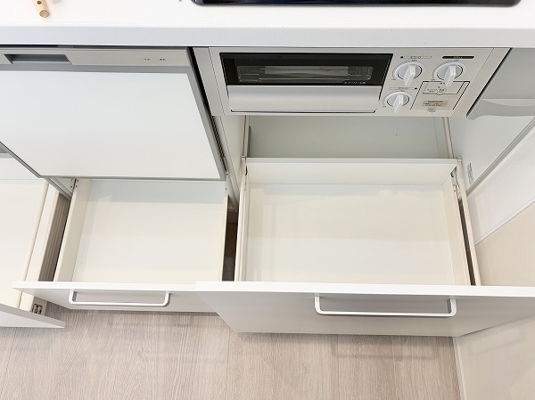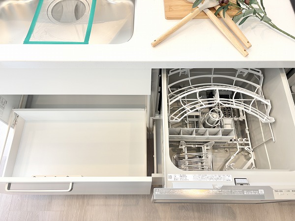 ホワイトを基調とした明るく爽やかなシステムキッチン。リビングへ料理を配膳しやすいカウンタータイプで、家事動線の良さが魅力的です✿洗い物の負担を軽減してくれる食洗機付きなので、忙しい日の強い味方になってくれそう。