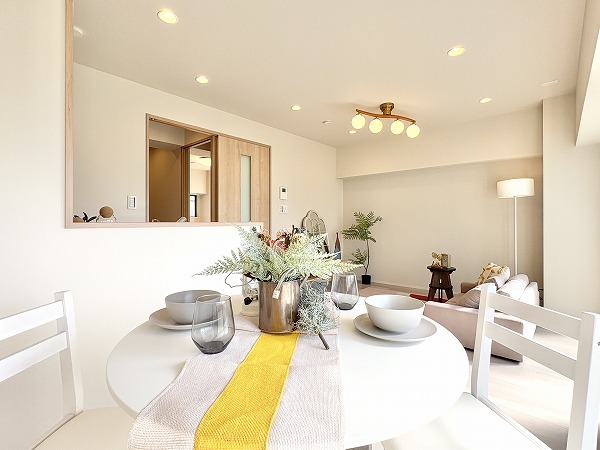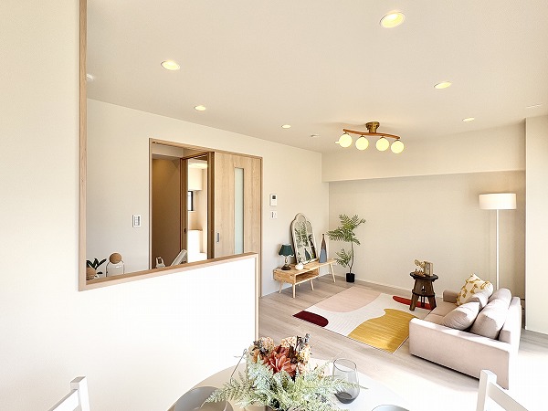 約11.0帖のリビングダイニングキッチンは、南東向きのバルコニーから柔らかな日が差し込む心地の良い空間でした。大きなテラス窓から開放感を感じられますよね。相性バッチリな木目調×ホワイトの内装デザインは、ゆったりとくつろげる雰囲気を演出してくれています。