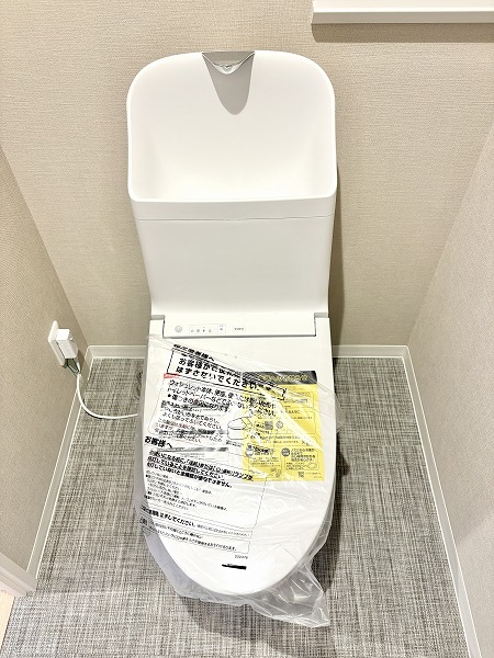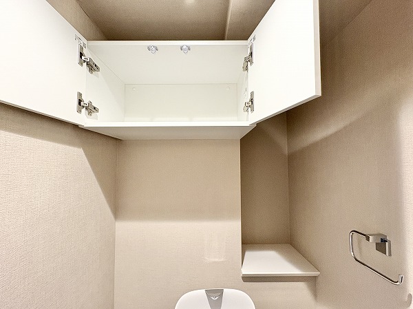 淡いベージュのクロスから落ち着いた雰囲気を感じられる独立タイプのトイレ。手洗い一体型になっているので節水に取り組めます。上部には棚が設置されていて、トイレットペーパーや清掃用品をしまうことが可能です◎