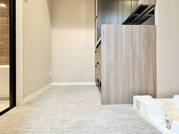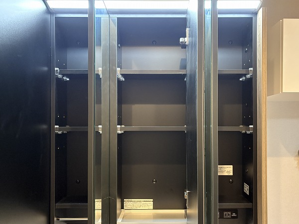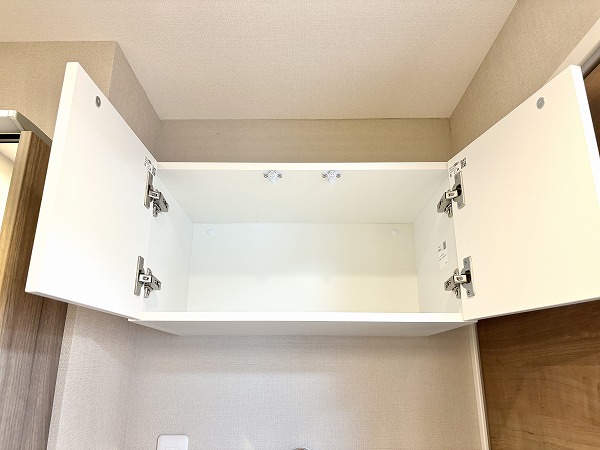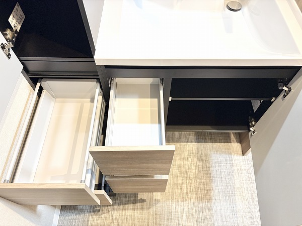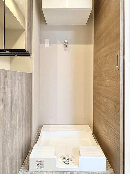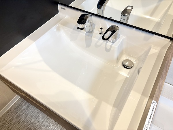 独立洗面化粧台には、3面タイプのミラーキャビネットが完備されています。鏡裏や洗面台下の収納が充実しているので、化粧品や洗剤など用途ごとにしまう場所を分けて綺麗に保管することができそうです。洗面化粧台、洗濯機置き場、バスルームが1つの場所にまとまっていて、家事動線がスムーズなのが嬉しい。