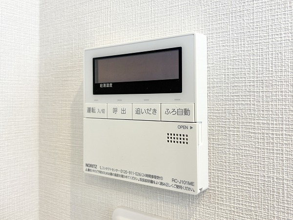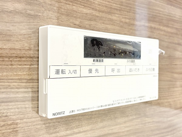 バスルームは、ブラウンのバスパネルが空間全体を落ち着いた雰囲気にしてくれています。ワイドなミラー付きで開放感を感じられるのもポイント。快適なご入浴に欠かせない追い焚き機能が搭載されているので、ワンタッチでお湯を温め直すことが可能です◎