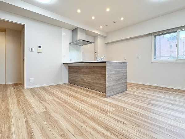 今回ご紹介するのは専有面積62.24㎡、パートナーとの2人暮らしにおすすめの2LDKのお部屋。天井にある複数のライトが室内を明るく照らしてくれています。ペットの飼育が可能なので、大切なご家族と一緒に暮らせますよ♪