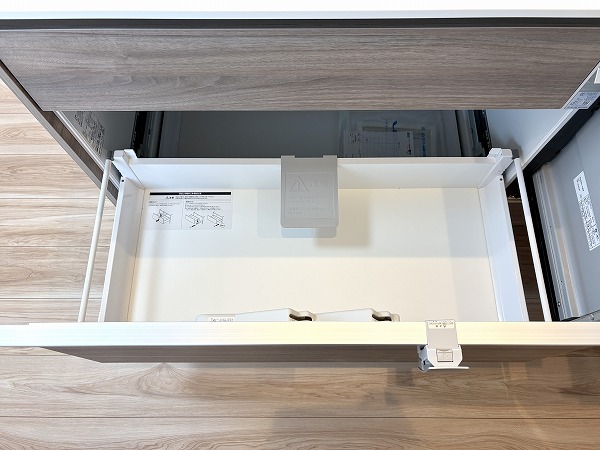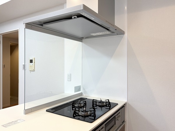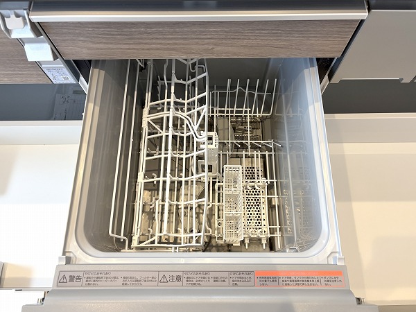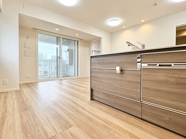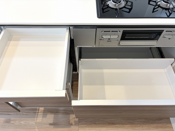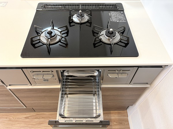 リビングダイニングにいるご家族やゲストとコミュニケーションを取りやすい、ペニンシュラ型のキッチンです。配膳がしやすい動線の良さも特徴✦家事をスムーズに進められる3口コンロ、グリル、食洗機が完備されています。