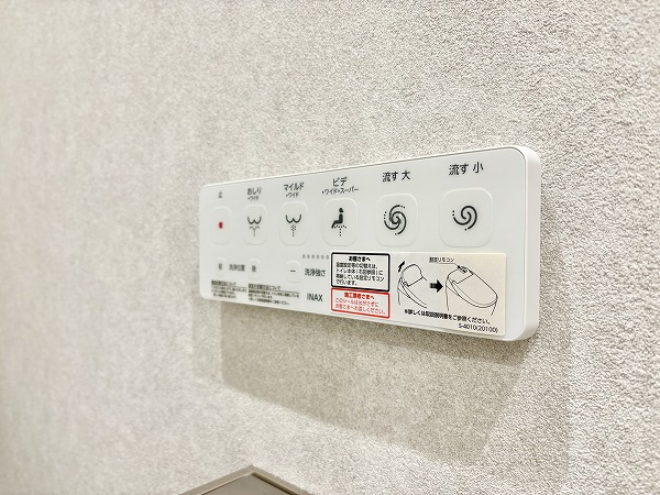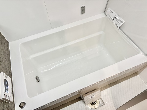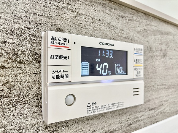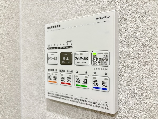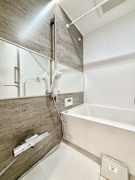 デザインパネルがお洒落なバスルームは、見た目の美しさだけでなく、機能面も充実✦追い焚き機能は、寒い冬でもバスタブのお湯が冷めることなく、半身浴を楽しめます。雨の日や花粉の時期でも気にせずに洗濯物を干せる浴室乾燥機も備わっていますよ♩
