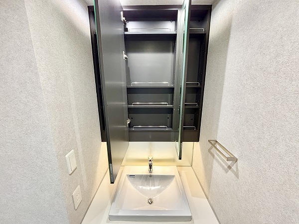 ミラーキャビネット仕様の洗面化粧台は、鏡の角度を変えられるため、後ろ髪の寝ぐせも発見できちゃいます♡細々とした洗面道具もしまえるので、コンパクトな空間もスッキリと保てますね♬洗面ボウルのサイドに物を置けるので、お化粧の際に便利です。