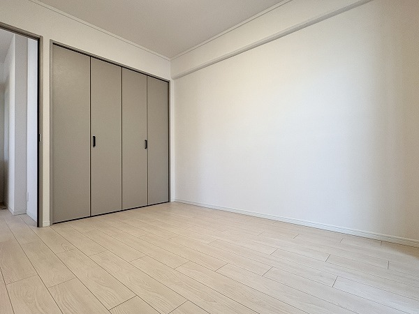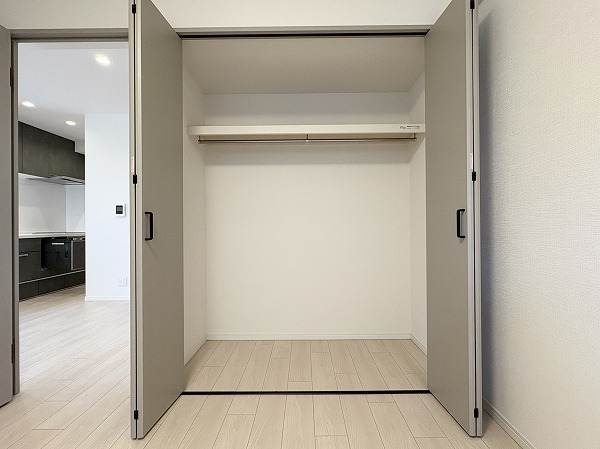 約6帖の洋室には衣装持ちの方も安心な大容量のクローゼットが設置されています!丈の長いアウターやワンピースなどをパイプハンガーに掛けて収納できますよ。上段にはシーズンオフのお洋服を畳んでしまっておくことが可能です。