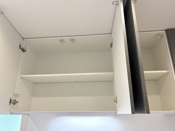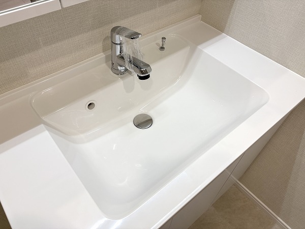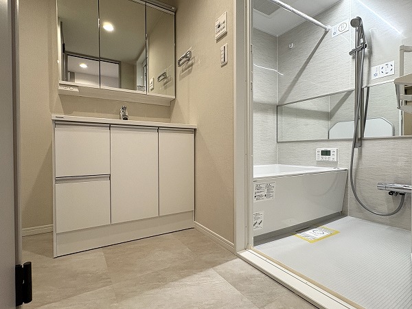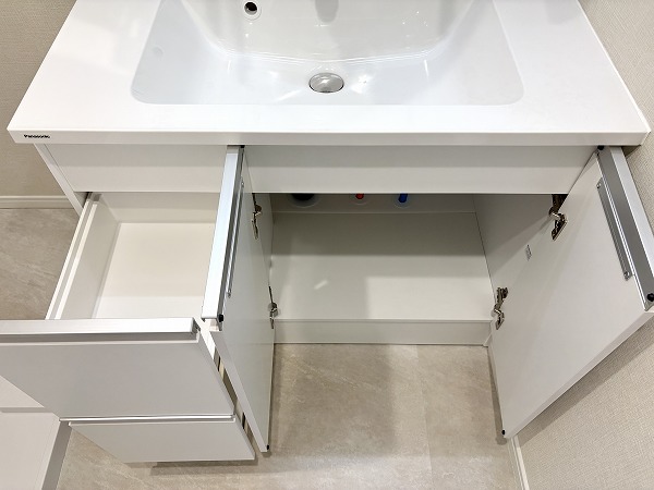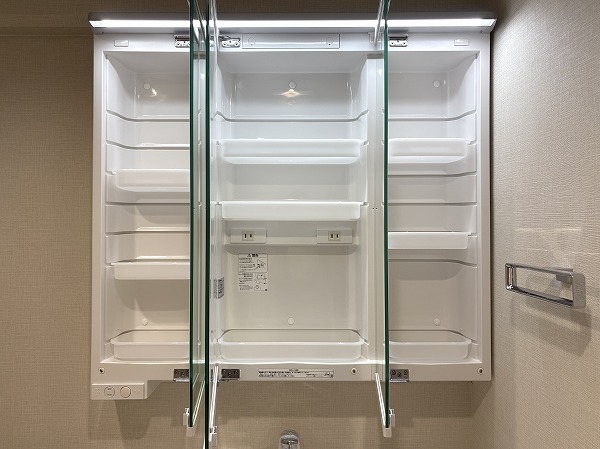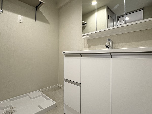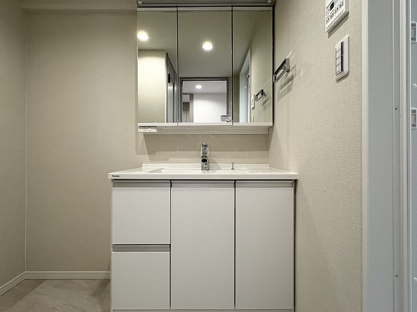 洗面化粧台は3面タイプのミラーキャビネットが完備されています。合わせ鏡としてお使いいただけるので、サイドや後頭部まで確認がしやすく身支度がスムーズに行えそうです。化粧品や衛生用品をしまうことのできる収納が充実していますよ。