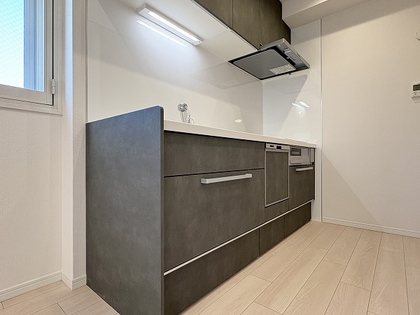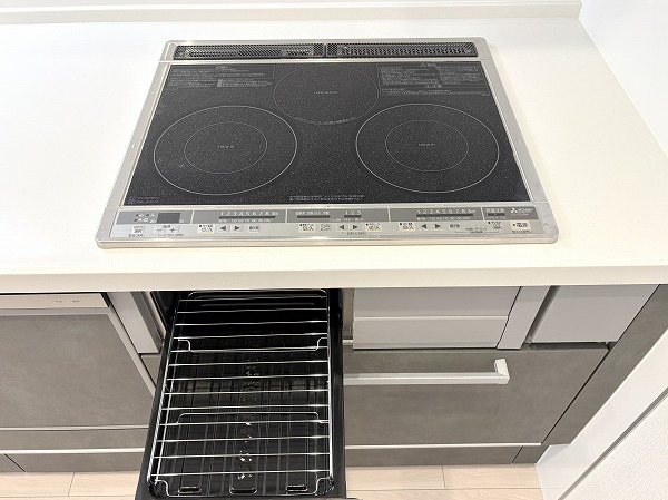 ダークグレーの配色がオシャレなシステムキッチンは、お料理に集中しやすい壁付け型です✨安全性が高く手入れのしやすいIHコンロが取り付けられています。グリルと食洗機も完備されているため、毎日の家事が捗りそうですね。