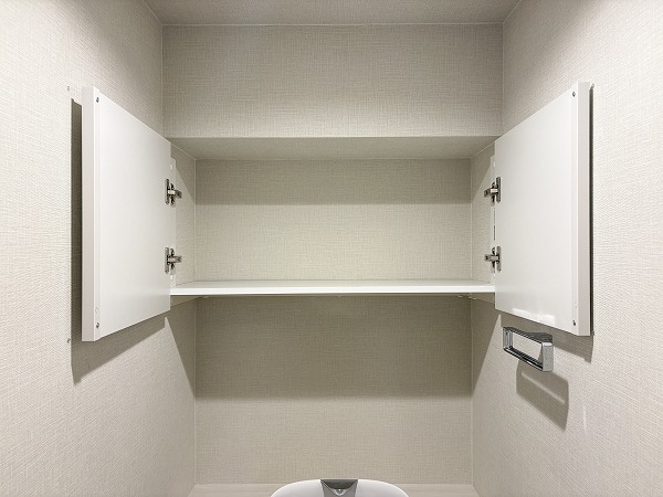 ホワイトの色味で統一されている独立タイプのトイレは飽きのこない爽やかなデザインです。上部にはトイレットペーパーや掃除用品を収納することができる棚が設けられています。手洗い一体型なので節水に取り組めますよ。