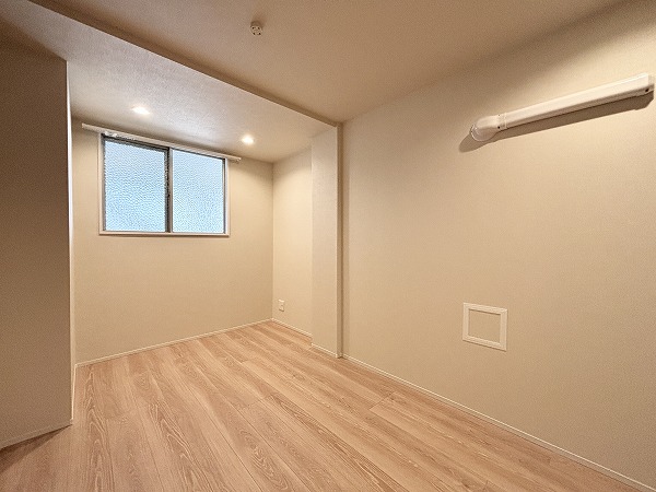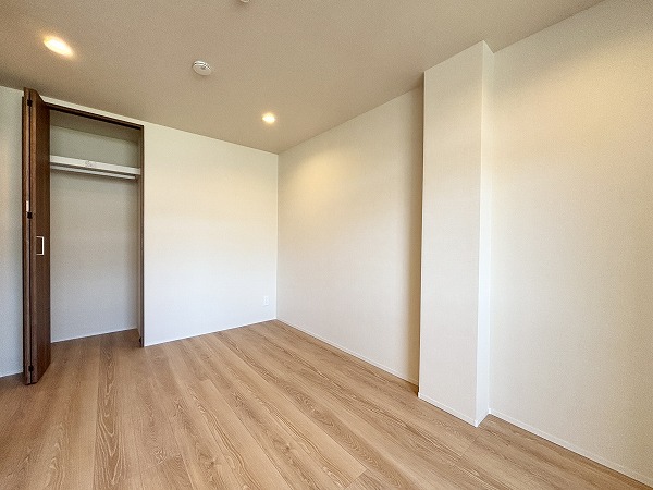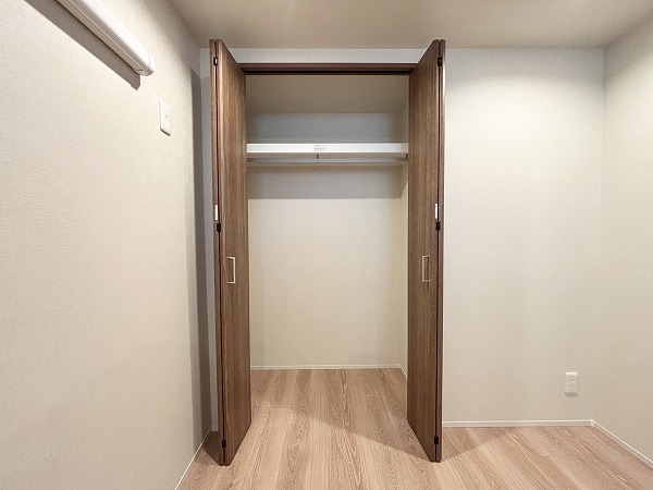 もう1つの洋室は約5.0帖。日差しは控えめですが、コンパクトな窓があり風通しは良好。大きなクローゼットがあるため、普段使いの服からシーズンオフの荷物まで整理可能。また、デッドスペースのない形なので家具の配置にも困りません◎