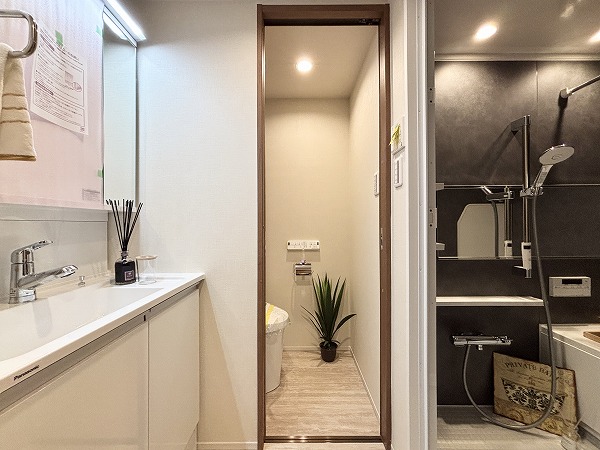 洗面化粧台やランドリースペース、トイレ、バスルームが一箇所に集まったサニタリースペースは、移動が少なく使いやすい設計。鏡裏収納や洗面台下収納で、洗剤類やドライヤーなどの収納場所にも困りません。