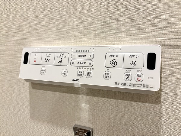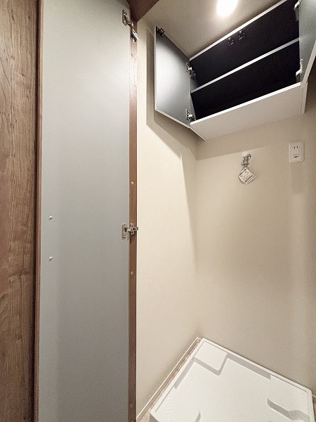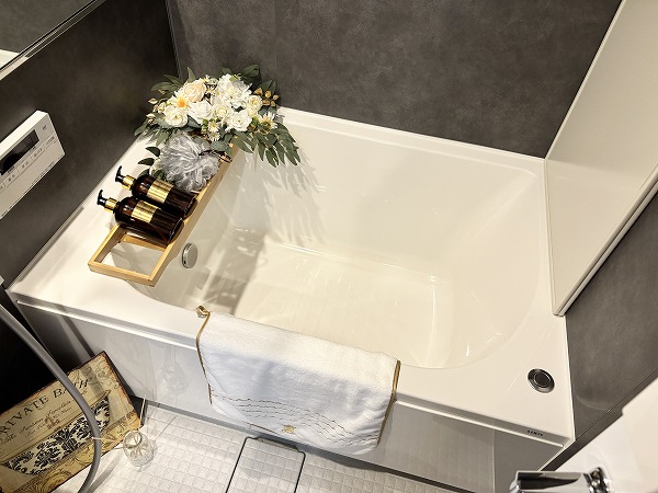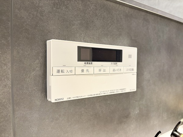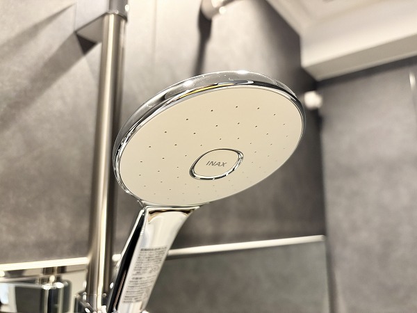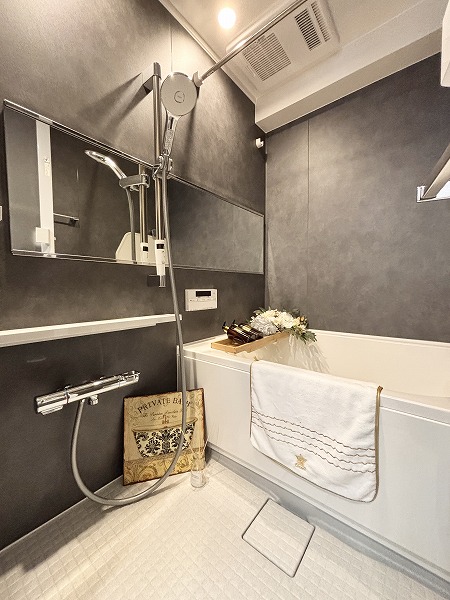 バスルームは落ち着きのあるグレーパネルを採用し、上質な雰囲気。シャンプーラックやスライドバーが備わっており、細部までこだわりを感じられました。もちろん、快適な入浴に欠かせない追い焚き機能も完備しているので、ゆったりとしたバスタイムを楽しめます♡