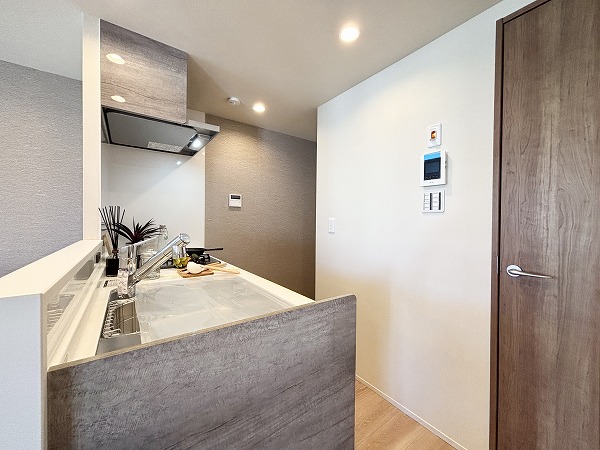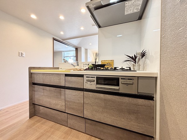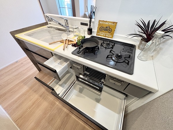 セミオープンタイプのシステムキッチンは、3口コンロとグリル付きで同時調理もスムーズです。さらに広めのシンクが後片付けのストレスを軽減◎収納力も抜群で、調理器具や調味料もたっぷり収納可能。