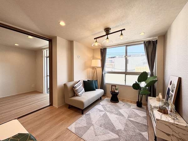 ご紹介する4階部分、専有面積61.60㎡の2LDKのお部屋は、2つの洋室がほぼ同じ広さで2人暮らしに心地よいバランスをもたらします。2025年11月にリノベーションが完了したばかりの室内は、新築のような清潔感に溢れていました✧、さらにペット飼育も可能なため、将来の暮らしの選択肢が広がる住まいです。