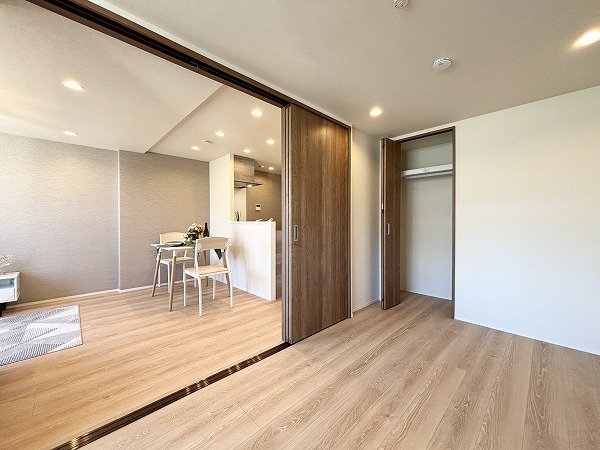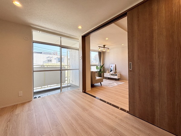 メインルーム横の約5.5帖の洋室は、大きな掃き出し窓からバルコニーへ直接アクセス可能。スライドドアを開放すると空間が繋がり、開放的なお部屋に様変わりします。ニーズによって使い分けられるのは嬉しいポイント。