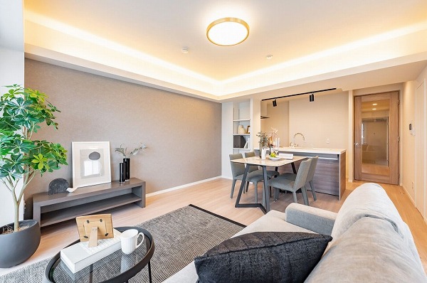 広さ約14.8帖のメインルームは明るい木目調のフローリングと白い壁でシンプルに仕上げられ、ライトグレーのアクセントクロスが空間をやさしく引き締めます。天井には間接照明を設けており、夜には柔らかい光で部屋全体を照らし、リラックスした時間を過ごせそうです。