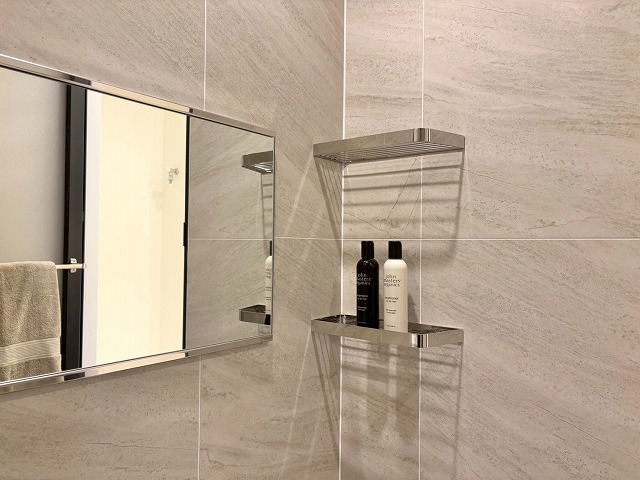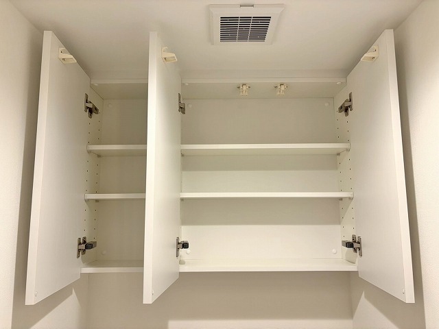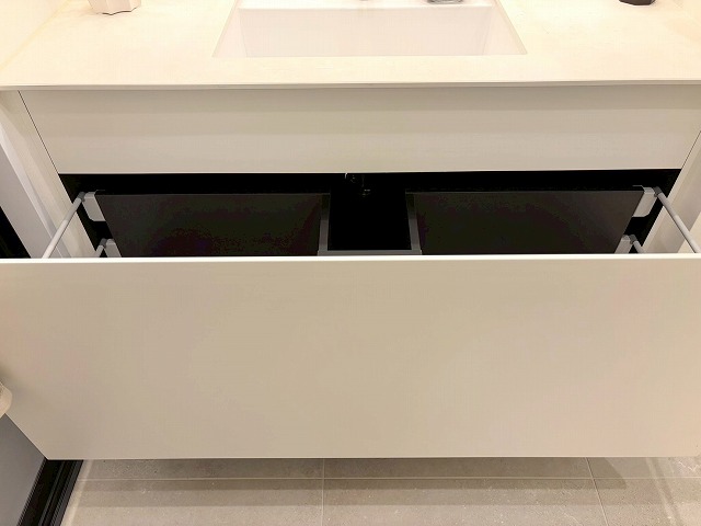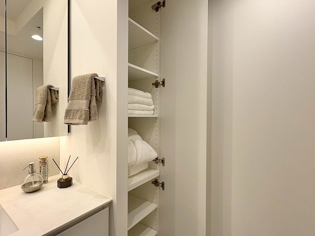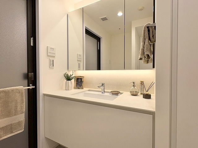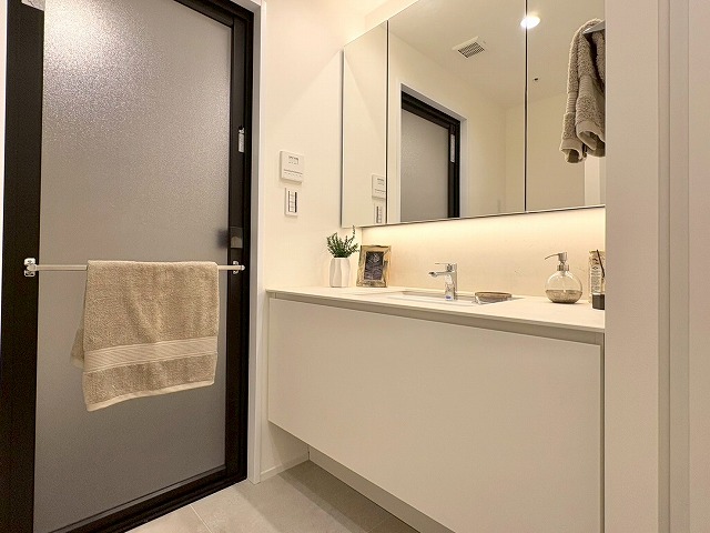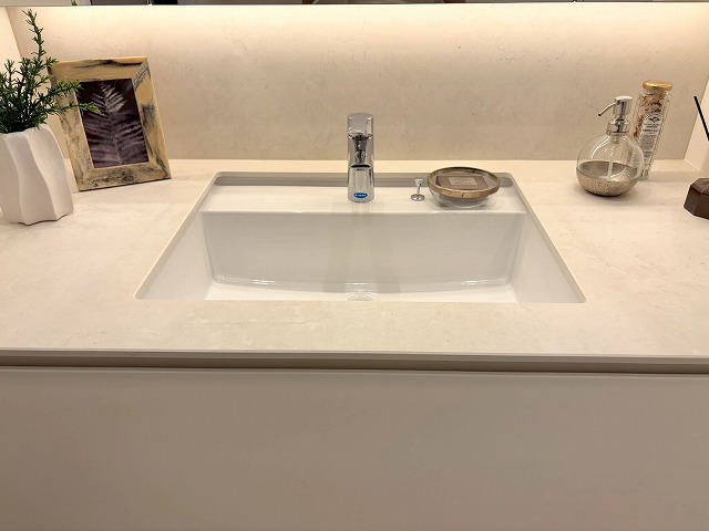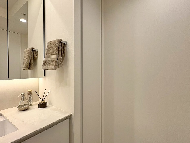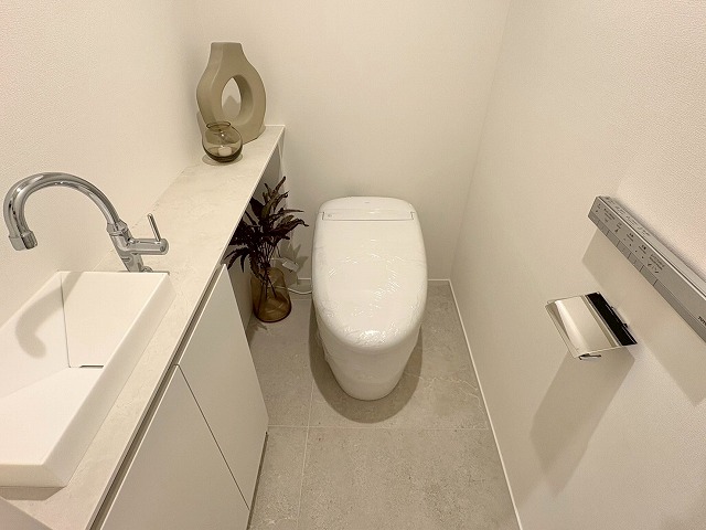 独立したトイレには手洗いカウンターを完備。ちょっとしたグリーンや香りを置くだけで、シンプルながらも心地よい空間に変わります。トイレットペーパーや掃除用品などはカウンター下収納をご活用くださいね。