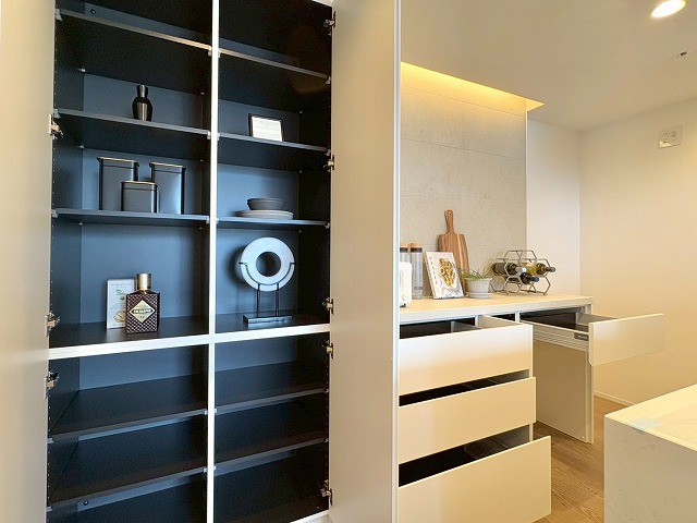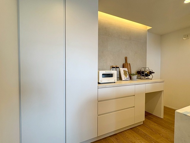 調理家電や食器、調理道具までたっぷり収納できるキッチンカップボードは、使い勝手の良さとデザイン性を両立。食材のストックもすっきり整理できる大容量設計で、作業スペースも広々。見た目にも上品なデザインは、キッチン全体の雰囲気を引き立ててくれています✦