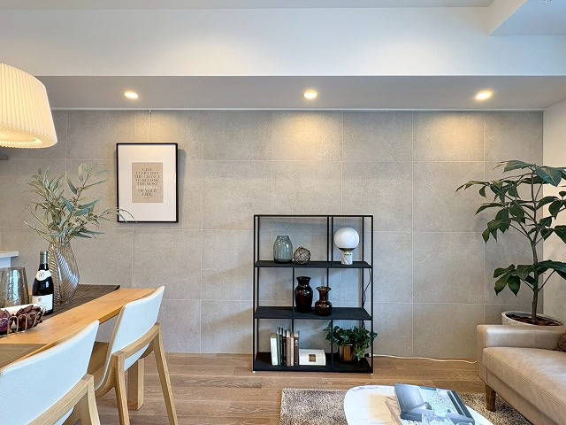 リビングの一面にはピクチャーレールを設置。お気に入りのアートや観葉植物を自由に飾れば、インテリア次第で雰囲気をガラリと変えられます。壁面がすっきりしているので、ソファやダイニングテーブルのレイアウトも自在!家具や雑貨で遊ぶ楽しさが広がる空間ですよ♥